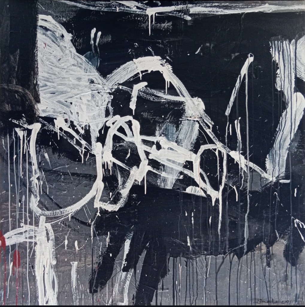 Jadi, setiap keputusan tentang warna,penempatan kolase, hingga derajat kemiringan kuas dan cat sedemikian rupa sehingga,,,hehehe…:-)senantiasa melewati validasi sistem estetik internal yang tentu saja sangat personal. Oleh karenanya gestur yang nampak bebas , instingtif,impulsif bahkan nampak chaotic itu sesungguhnya adalah matematika proses internal yang diartikulasikan secara visual.